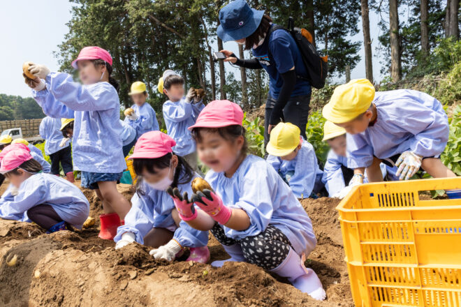 木の間インターナショナル保育園 2021.06.19 じゃがいも掘り 6月10日そら・もも・ひまわり組さんのみんなでじゃがいも掘りに行きました! じゃがいもを掘って!掘って!掘って!小石みたいに小さい物からみんなのほっぺくらいの大きい物までたくさんのじゃがいもを掘ってきました。みんなじゃがいもを見つけると笑顔でじゃがいもを見せてくれました。