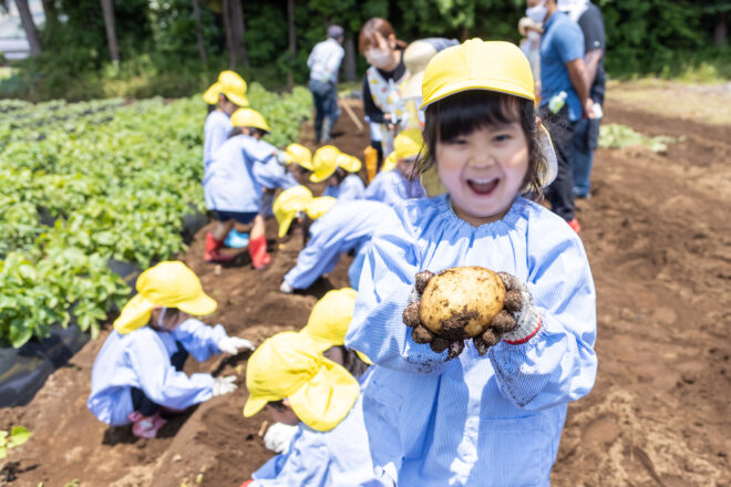 木の間インターナショナル保育園 2022.06.10 じゃがいも堀り 6月10日じゃがいも掘りに行ってきました。 みんなで土を掘っていくと大きなじゃがいもが出てきました。子どもたちはじゃがいもを見つけると『先生みてみて!」と嬉しそうに教えてくれました。