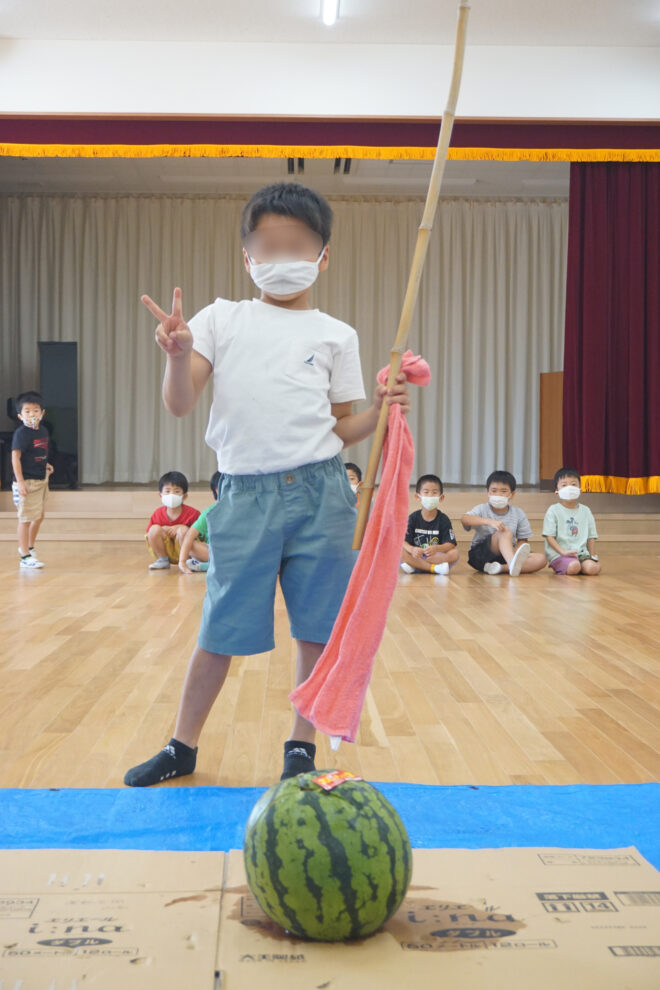 ⽊の間ニーニョスcome come 児童クラブ 2023.01.12 令和4年度:8月 夏の風物詩‼スイカ割り🍉 夏の風物詩!!スイカ🍉割り!! 夏といえば、スイカ割ですね!! 木の間ニーニョスで は、8/1(月)にホールにて、みんなでスイカ割を楽しみました。 子どもたち同士で「もうちょっと左!!」や「右!!右!!」などと声を掛け合い大盛り上がり!! 最初は、何度か当たってもなかなか割れなかったスイカも、みんなの力が加わっていき、次第にひびが入っていきます!! 子どもたちから歓声が上がり、最後は見事に割ることができました!! 上級生のお兄さん、お姉さんの力はやっぱり強いですね!!😊