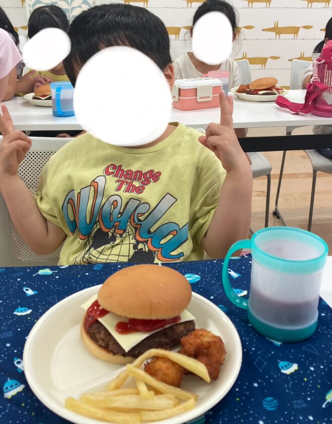 この日ランチを注文してくれた子は、バンズからパティ、トマト、スライスチーズ、ピクルスなどの具材を自分で挟みます🍅🥒🧀