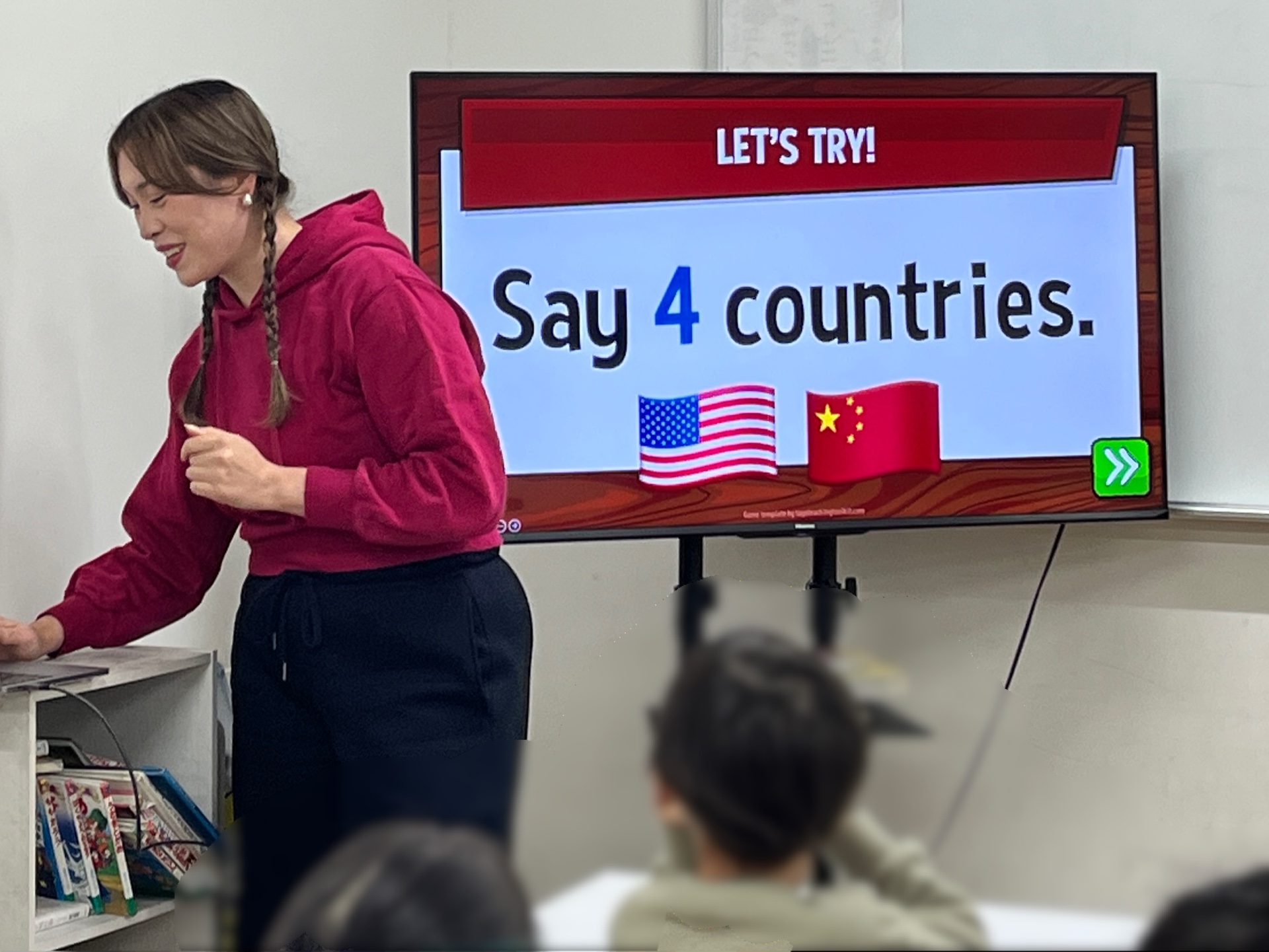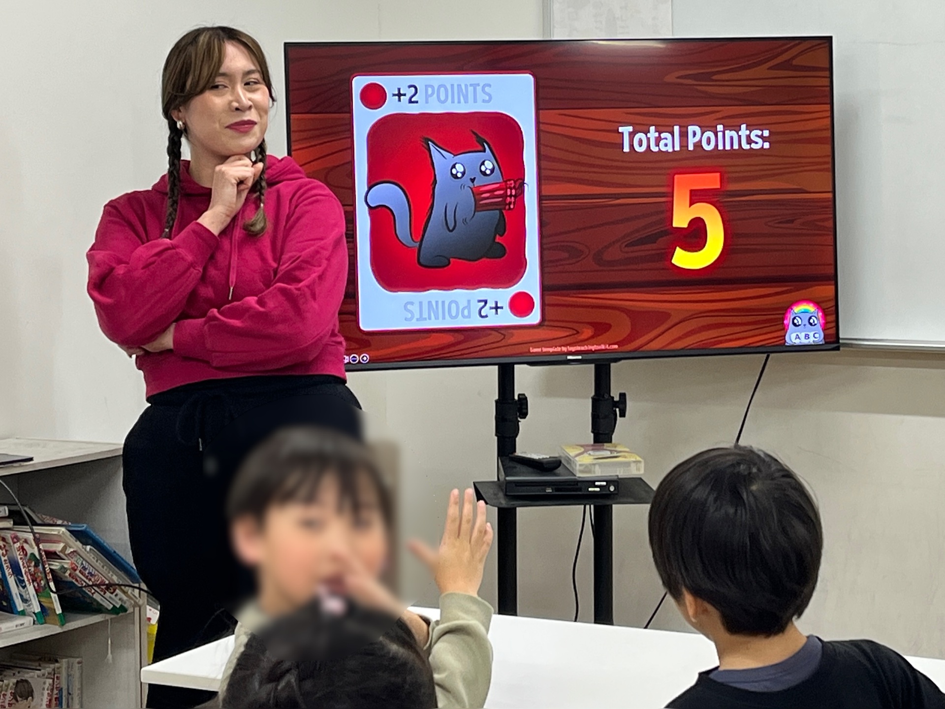 先日の学童の無料英会話では、映像を使ったチーム対抗の英語ゲームを行いました!